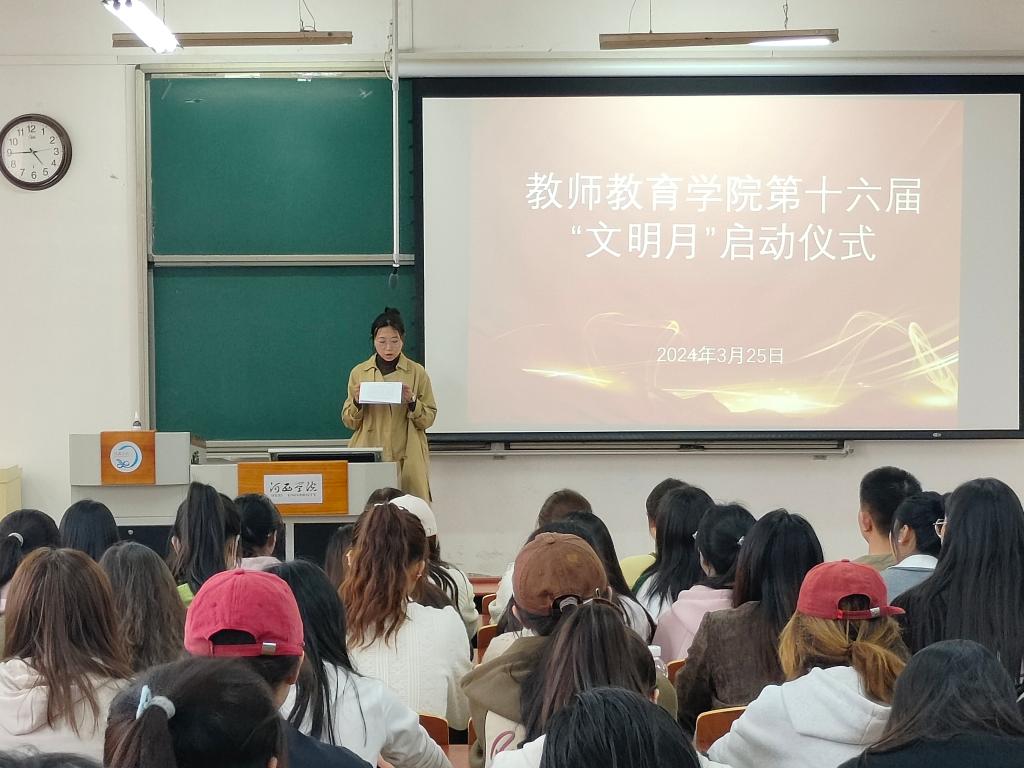 首先,辅导员朱彤老师宣读bevictor1946韦德官网第十六届“文明月”活动方案,号召员工做社会主义核心价值观的坚定信仰者、积极传播者、模范践行者。然后,心理231班李若菡作为新生代表发言,代表新生积极响应活动号召,提升自身素质,争做文明员工,共同建设美丽校园;学前214班郑昊天同学宣读第十六届“文明月”活动《倡议书》,倡议大家要践行文明要求,自觉维护校园和宿舍环境,主动学习文明思想,创建文明课堂,做最美老员工。最后,公司领导强调,要落实公司方案要求,明确工作目标和工作责任,建设公司特色文化活动,进一步促进校园精神文明建设。