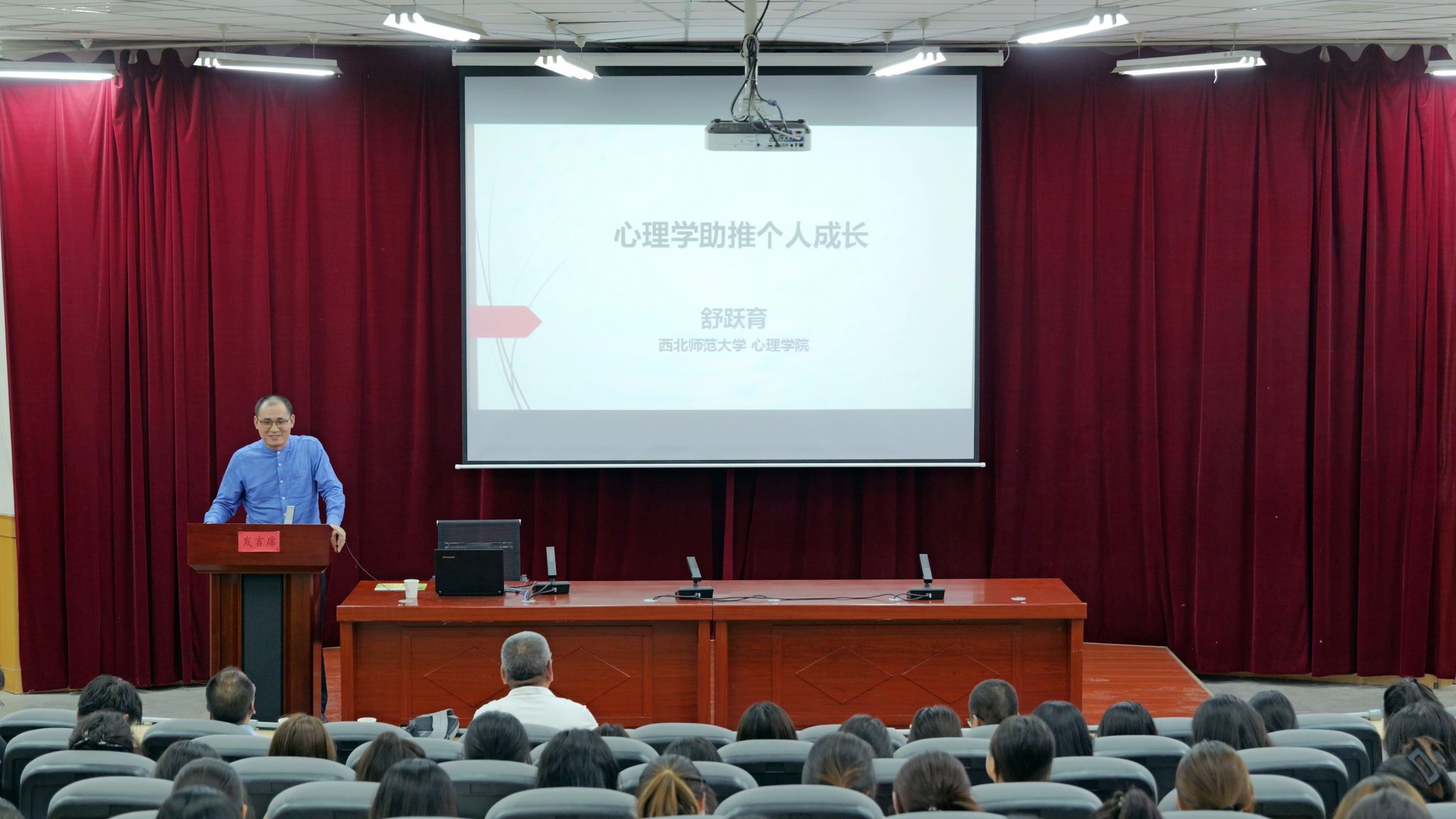 舒跃育教授以“心理学助推个人成长”为题,从内在标准与外在标准的平衡,到个人成长条件的优化等多个维度展开,通过《西游记》《水浒传》等经典名著人物心理的分析,引导同学们探索心理健康,激发了师生对个人发展的内部动机、善用性格优势、完善人格认知、挖掘自身潜能、最终实现自我价值等问题的深度思考。